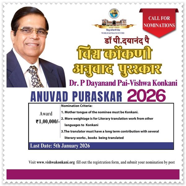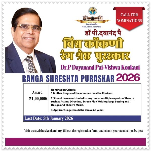 ವಿಶ್ವ ಕೊಂಕಣಿ ಕೇಂದ್ರಾ ಕಡಲ್ಯಾನ 2025 – 2026 ವರ್ಸಾಂ ಖಾತೀರ “ಡೊ.ಪಿ.ದಯಾನಂದ ಪೈ ವಿಶ್ವ ಕೊಂಕಣಿ ರಂಗ-ಶ್ರೇಷ್ಠ ಪುರಸ್ಕಾರ” ಆನಿ “ಡೊ. ಪಿ. ದಯಾನಂದ ಪೈ ವಿಶ್ವ ಕೊಂಕಣಿ ಅನುವಾದ ಪುರಸ್ಕಾರ” ಹ್ಯಾ ಪ್ರಶಸ್ತಿ ಖಾತೀರ ಅರ್ಜ ಆಪಯ್ಲ್ಯಾ ಆಸುನ್, ರಂಗ ಶ್ರೇಷ್ಠ ಪುರಸ್ಕಾರಾ ಖಾತೀರ ಸಾಠ ವರ್ಸಾಂ ವಯರ ಪಿರಾಯೇಚ್ಯಾ, ಕೊಂಕಣಿ ಉಲೊವಪಿ, ಆನಿ ಚಿತ್ರಪಟ, ನಾಟಕಾಂತ ಅಭಿನಯ, ದಿಗ್ದರ್ಶನ, ನಾಟಕ ಲೇಖನಾಚ್ಯಾ ಮಳಾರ ಜೀಣಭರ್ ವಾವ್ರ ದಿಲ್ಲ್ಯಾ ನಾಟ್ಯ ವೆವಸಾಯಿಕಾಂ ಕಡಲ್ಯಾನ ಥೆಟ ವಾ ಬರ್ಯಾಂ ಮಾಗಪ್ಯಾಂ ಕಡಲ್ಯಾನ ಪ್ರಸ್ತಾವ ಆಮಂತ್ರಣ ಕರತಾತ.