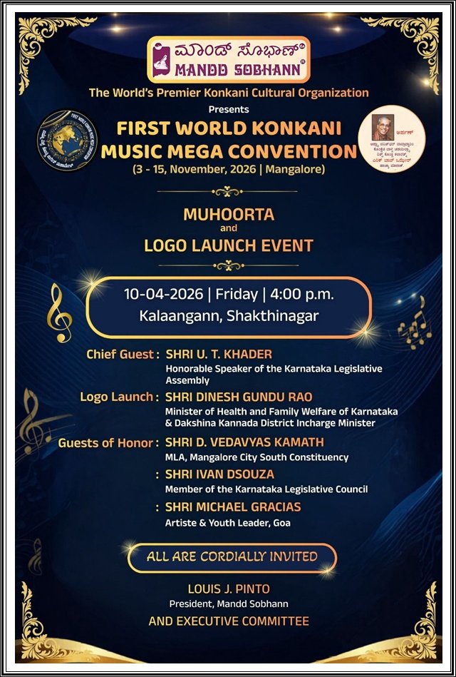ನವೆಂಬರ್ 03 ಥಾವ್ನ್ 15 ಪರ್ಯಾಂತ್ ಚಲ್ಚ್ಯಾ ಹ್ಯಾ ಬೃಹತ್ ಸಂಗೀತ್ ಸಮಾವೇಶಾಚೆಂ ಮುಹೂರ್ತ್ ಆನಿ ಲಾಂಛನ್ ಉಗ್ತಾವಣ್ ಕಾರ್ಯೆಂ ಸುಕ್ರಾರಾ, ಎಪ್ರಿಲ್ 10 ವೆರ್ ಕಲಾಂಗಣಾಂತ್ ಸಾಂಜೆರ್ 4.00 ವರಾಂಚೇರ್ ಚಲ್ತಲೆಂ ಮ್ಹಣ್ ಮಾಂಡ್ ಸೊಭಾಣ್ ಅಧ್ಯಕ್ಷ್ ಲುವಿ ಜೆ. ಪಿಂಟೊ ಹಾಣಿ ಪತ್ರಾ ಪರಿಶದೆಂತ್ ಜಾಹೀರ್ ಕೆಲೆಂ.